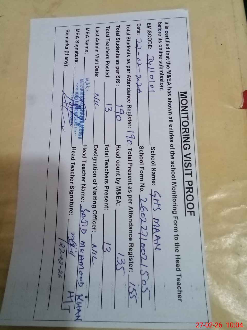 | Attendance Register | Head Teacher | MEA with School | Visit Proof |
