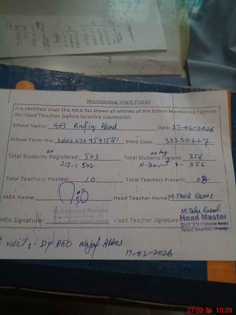| Attendance Register | Head Teacher | MEA with School | Visit Proof |
