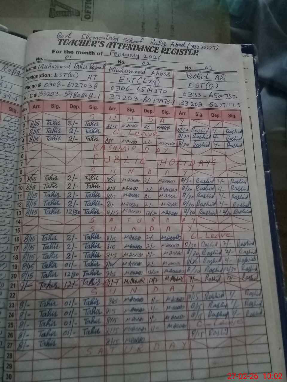 | CNIC | Full Name | Designation | R/C | Absence During Last Calender Month |