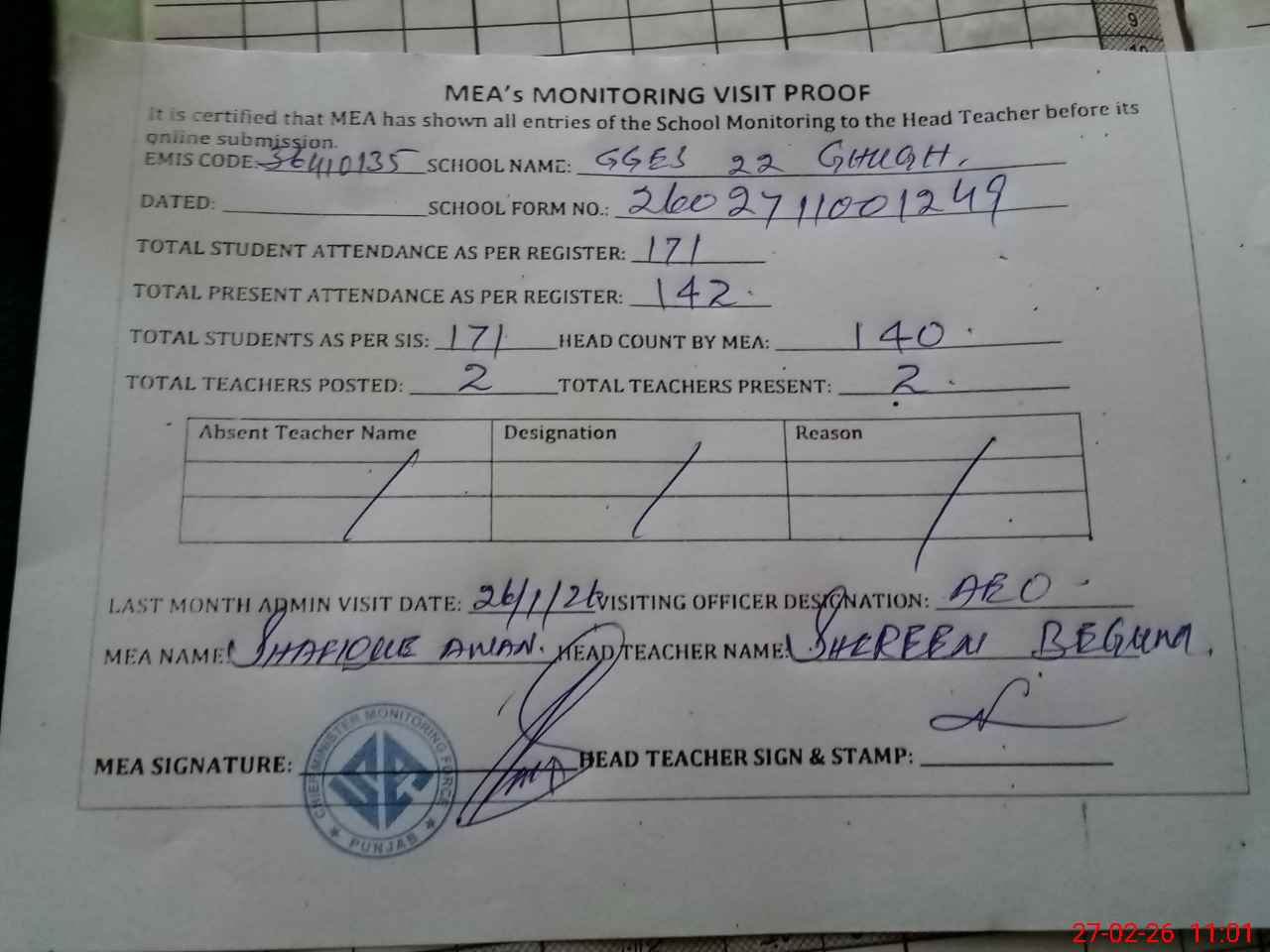 | Attendance Register | Head Teacher | MEA with School | Visit Proof |