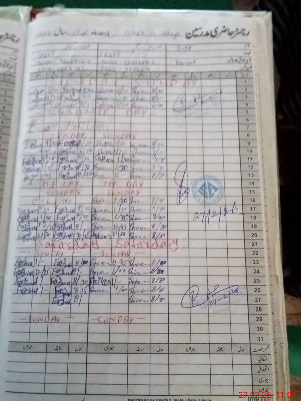 | CNIC | Full Name | Designation | R/C | Absence During Last Calender Month |