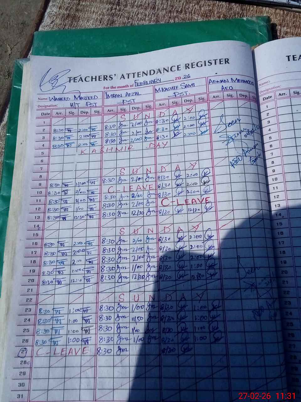 | CNIC | Full Name | Designation | R/C | Absence During Last Calender Month |