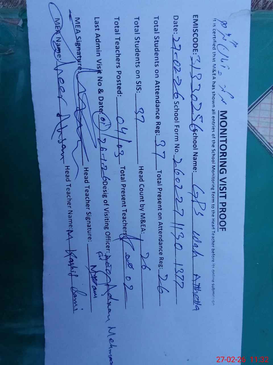 | Attendance Register | Head Teacher | MEA with School | Visit Proof |
