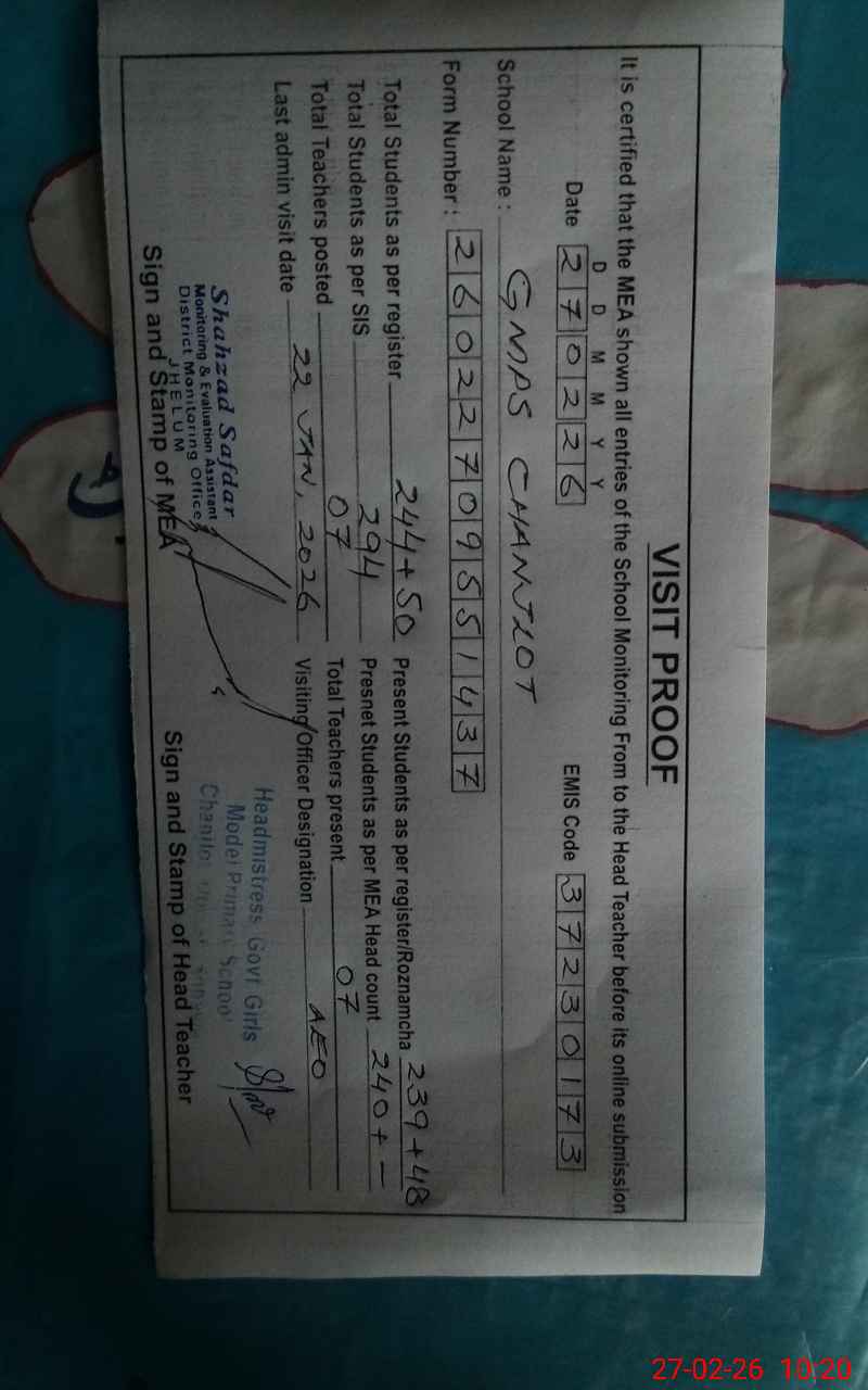 | EMIS Code: 37230173 | Name of School: GMPS CHANJLOT | |||
