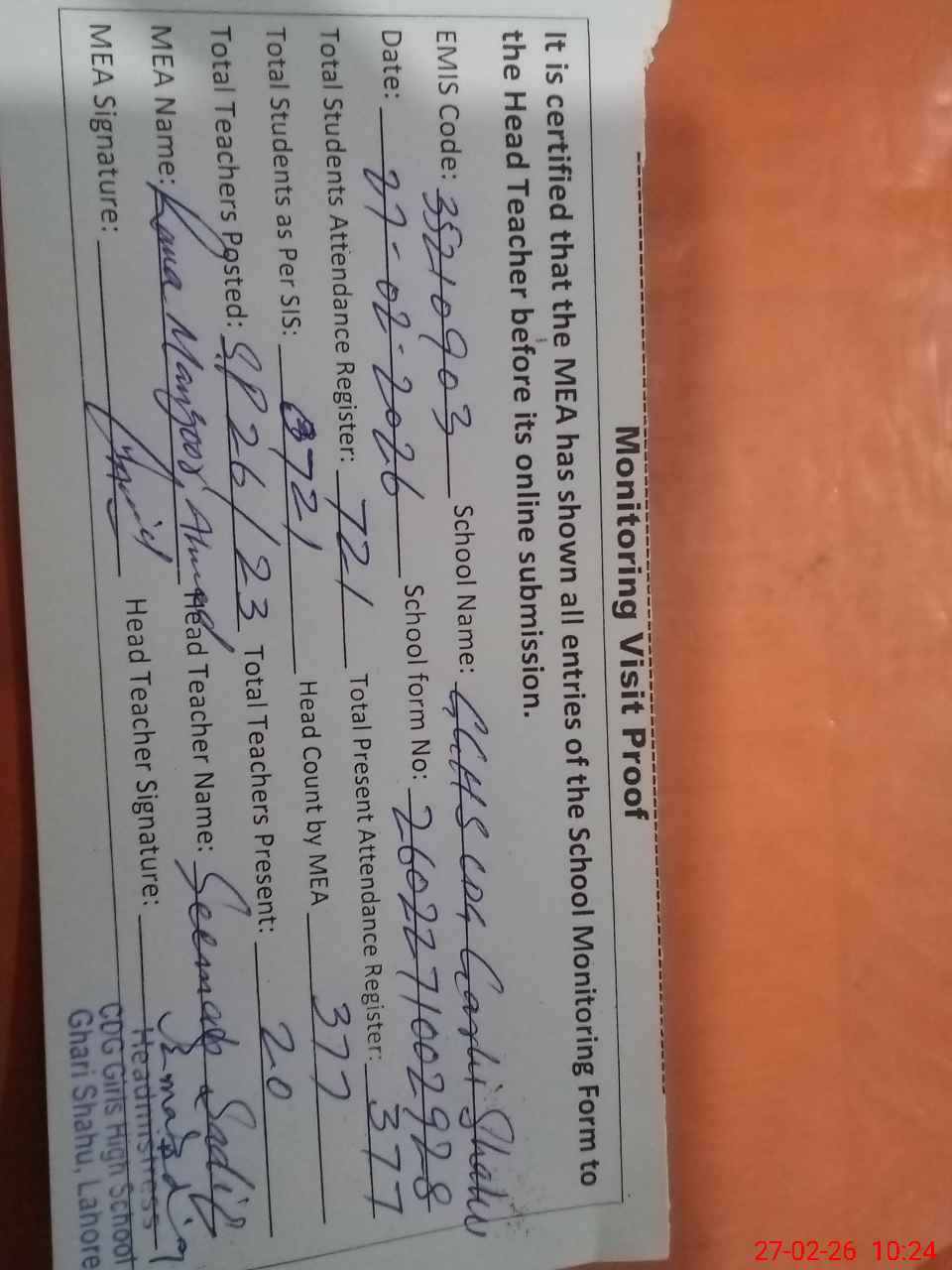 | Attendance Register | Head Teacher | MEA with School | Visit Proof |
