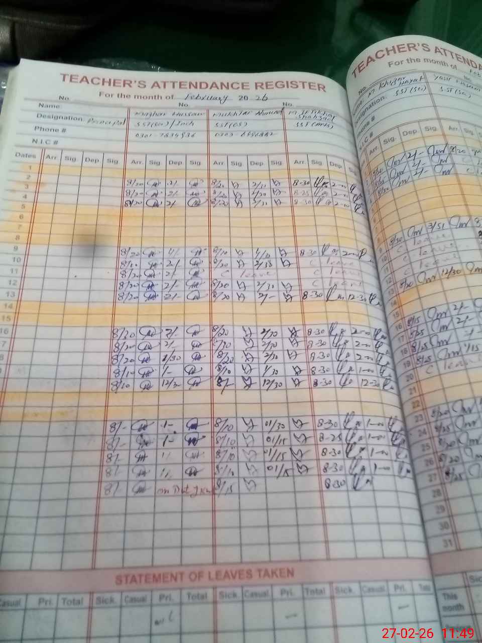 | CNIC | Full Name | Designation | R/C | Absence During Last Calender Month |