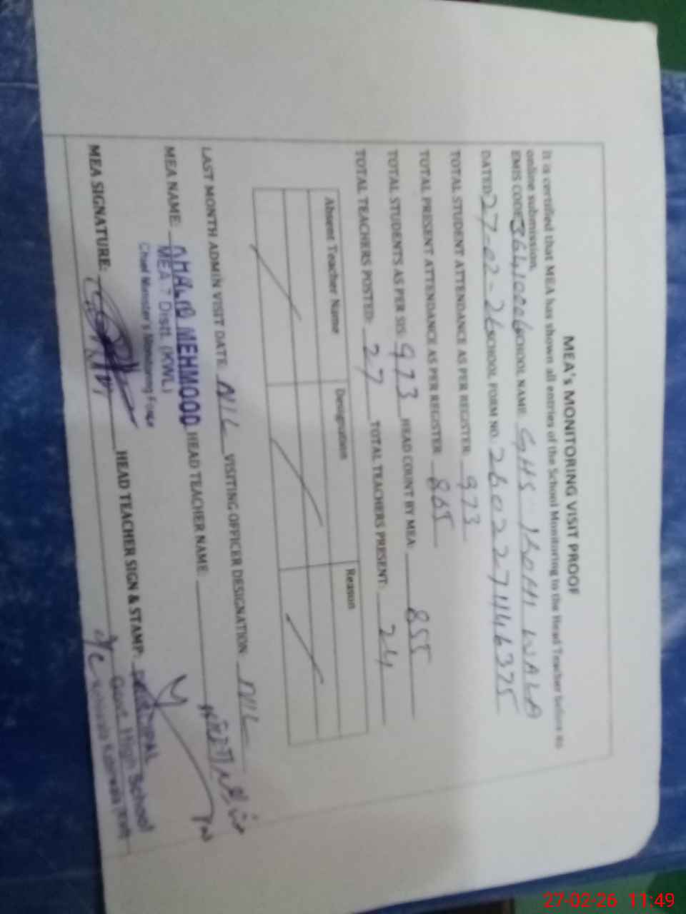 | Attendance Register | Head Teacher | MEA with School | Visit Proof |