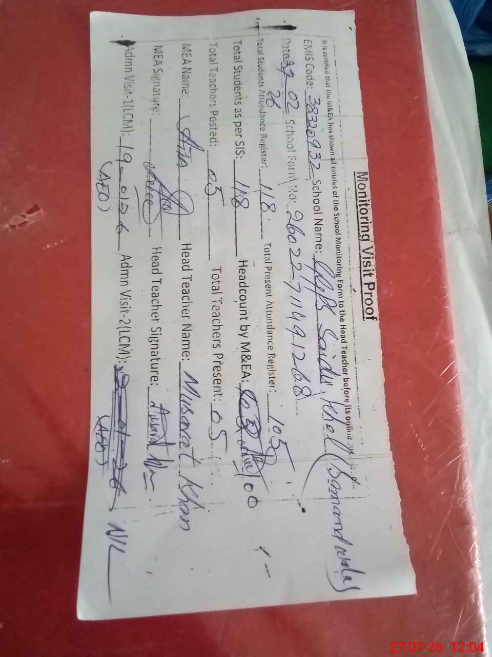 | Attendance Register | Head Teacher | MEA with School | Visit Proof |