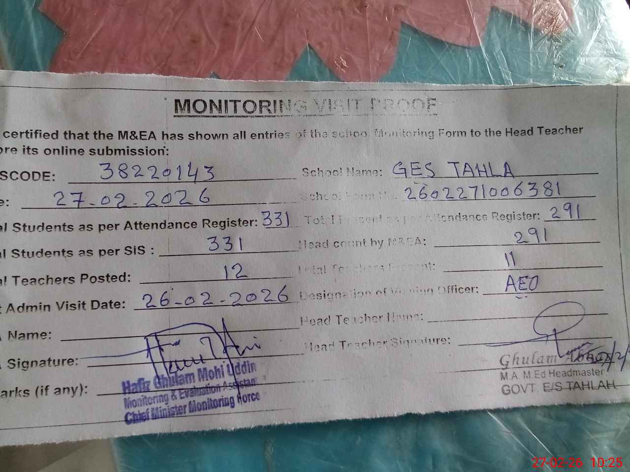 | Attendance Register | Head Teacher | MEA with School | Visit Proof |