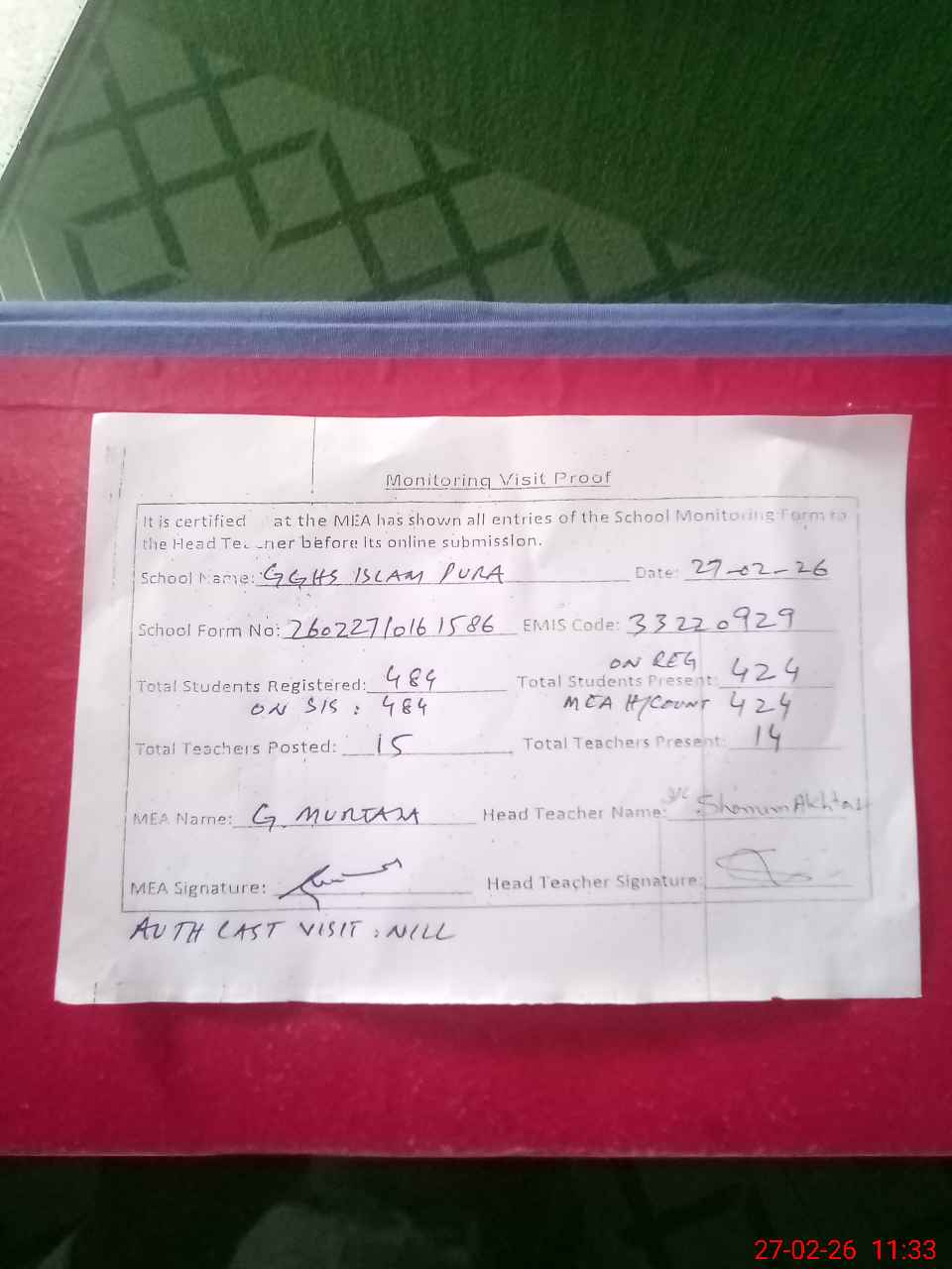 | EMIS Code: 33220929 | Name of School: GGHS ISLAM PURA (Newly upgraded 2025) | |||