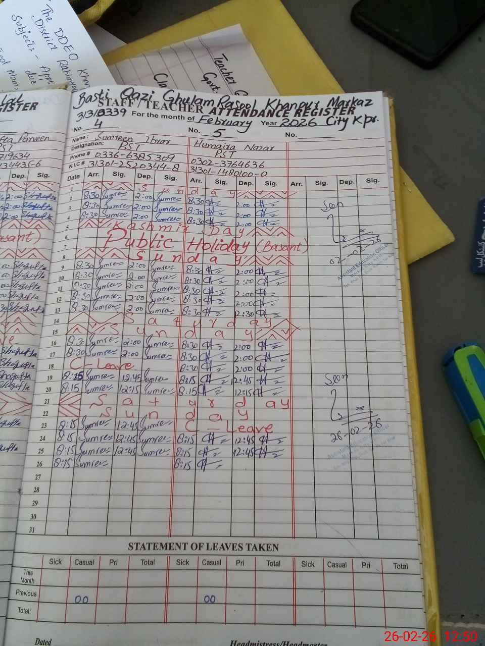 | CNIC | Full Name | Designation | R/C | Absence During Last Calender Month |