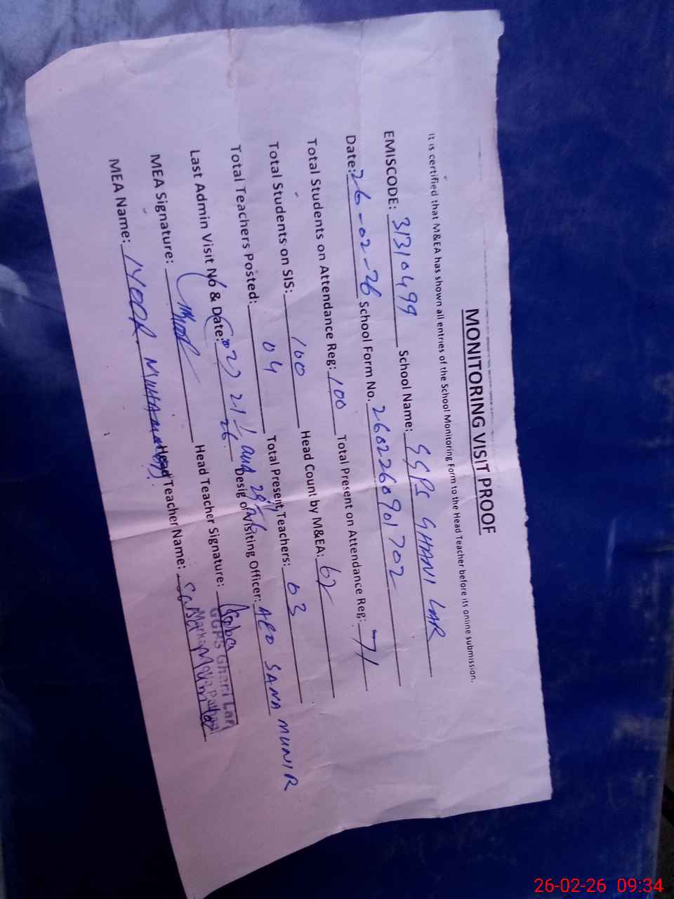 | Attendance Register | Head Teacher | MEA with School | Visit Proof |