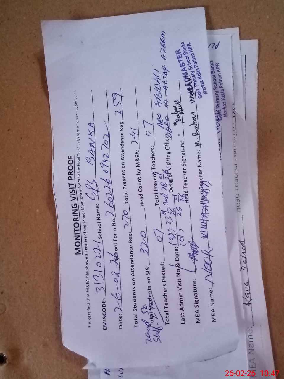 | EMIS Code: 31310221 | Name of School: GPS BANKA (After Noon) | |||
