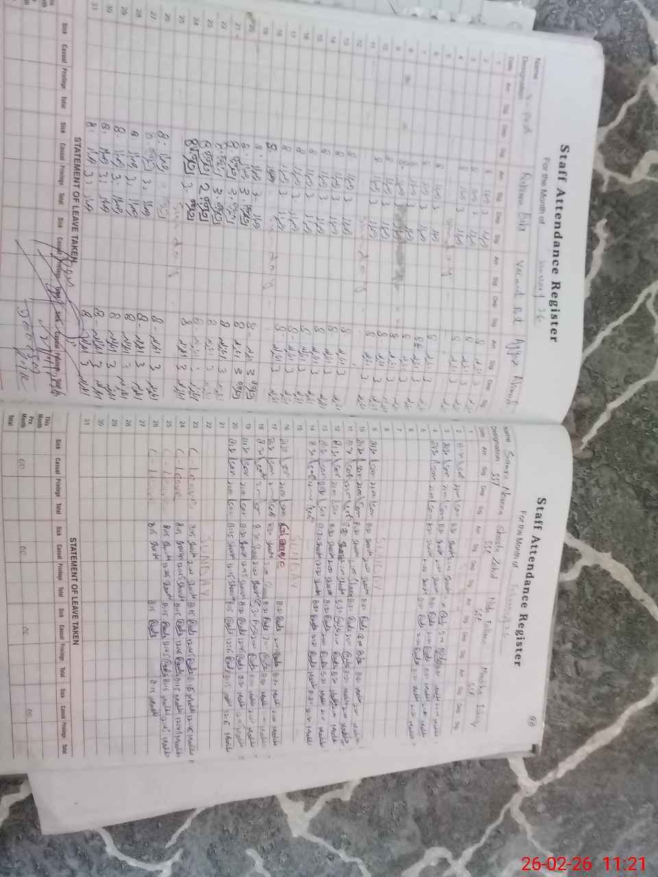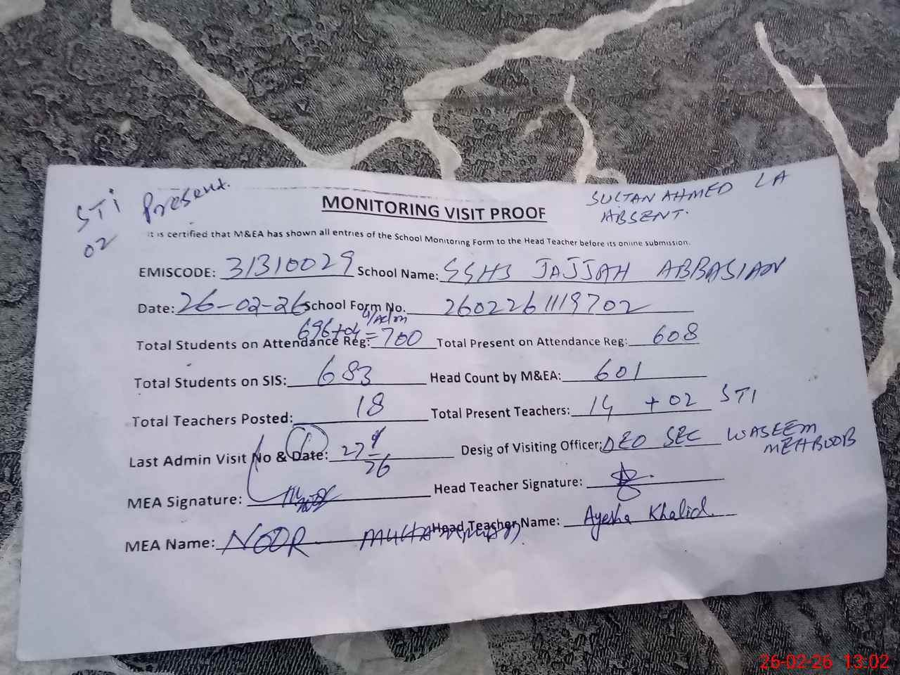| Remarks (Use Separate Page if Required): Sultan Ahmed is absent from the school sanctioned leave not available at school EST Rabia Younas is absent from school no original order/Leave/ Medical records show me by head | |||||
