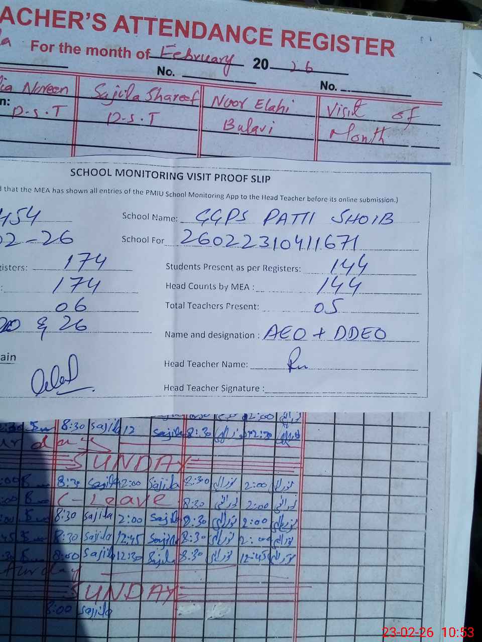 | Attendance Register | Head Teacher | MEA with School | Visit Proof |