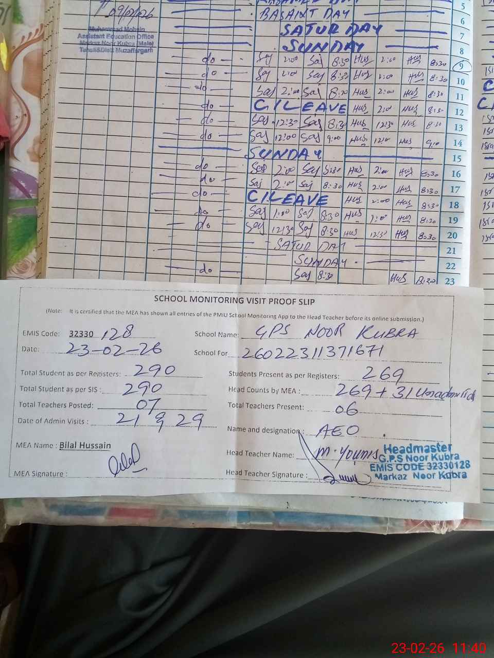 | Attendance Register | Head Teacher | MEA with School | Visit Proof |