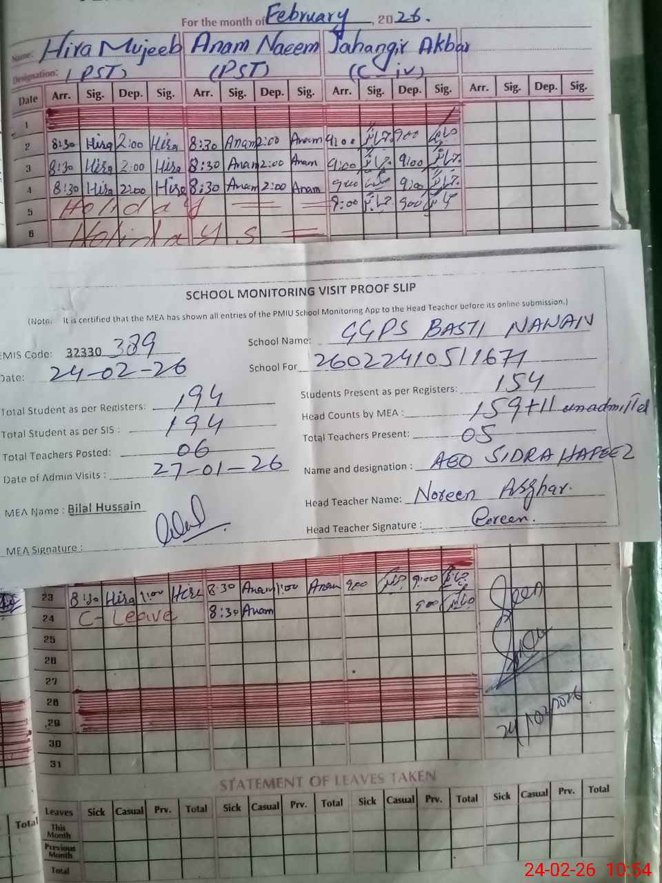 | Attendance Register | Head Teacher | MEA with School | Visit Proof |