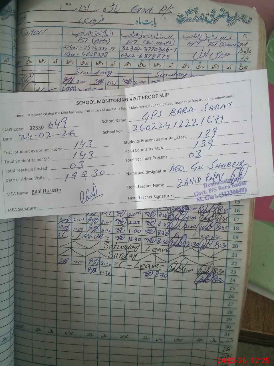 | EMIS Code: 32330649 | Name of School: GPS BARA SADAT | |||