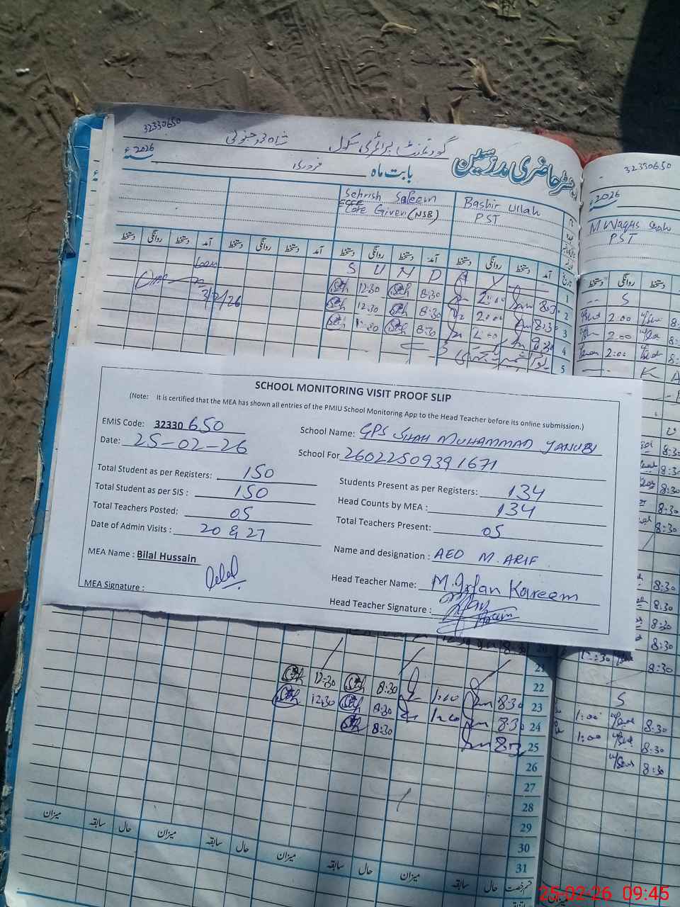 | Attendance Register | Head Teacher | MEA with School | Visit Proof |