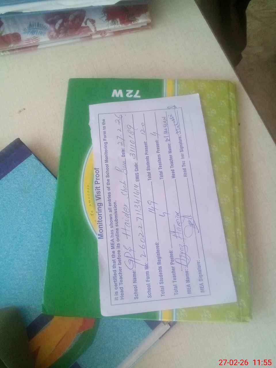 | Attendance Register | Head Teacher | MEA with School | Visit Proof |