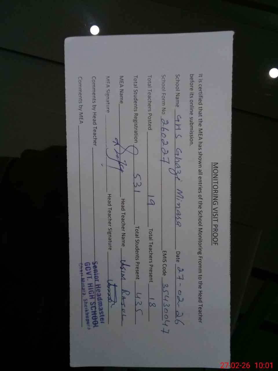 | EMIS Code: 35430047 | Name of School: GHS GHAZI MINARA SHEIKHUPURA | |||