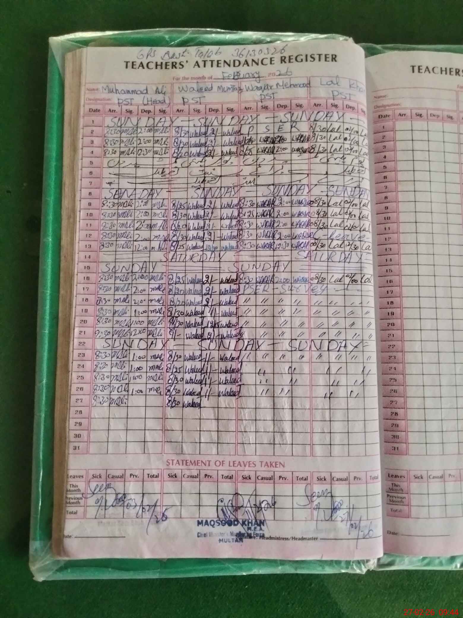 | Name: MU**** AL**** Designation: (School Headmaster's/Headmistress's) HEADMASTER Phone/Cell Number: 03**** |