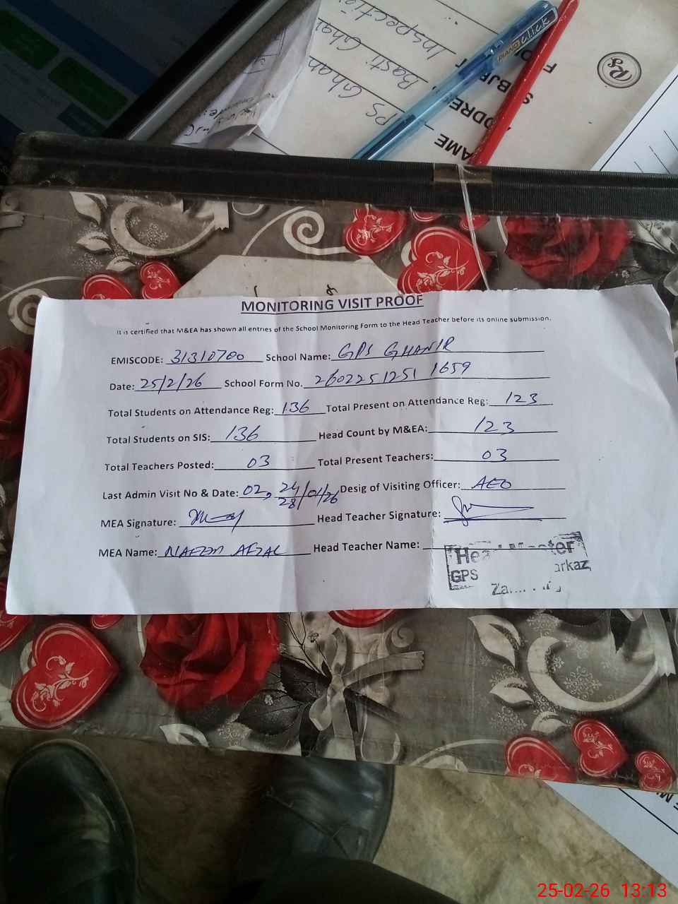 | Attendance Register | Head Teacher | MEA with School | Visit Proof |