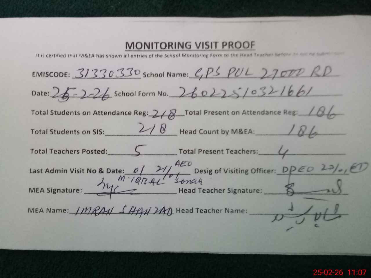 | Attendance Register | Head Teacher | MEA with School | Visit Proof |