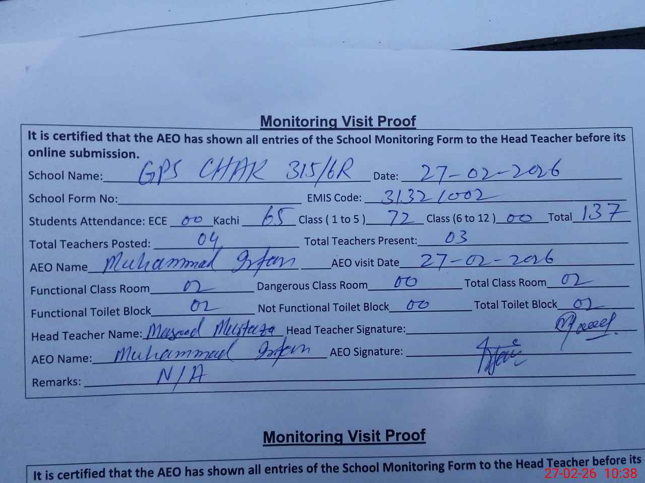 | EMIS Code: 31321002 | Name of School: GPS CHAK NO.315 | |||