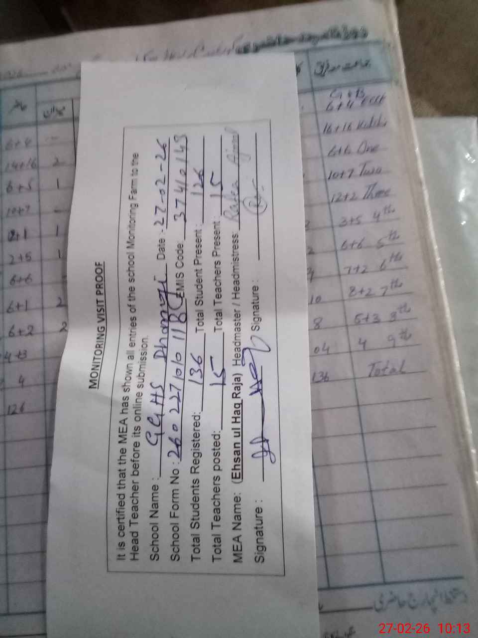 | Attendance Register | Head Teacher | MEA with School | Visit Proof |