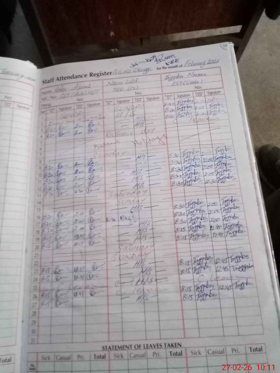 | CNIC | Full Name | Designation | R/C | Absence During Last Calender Month |