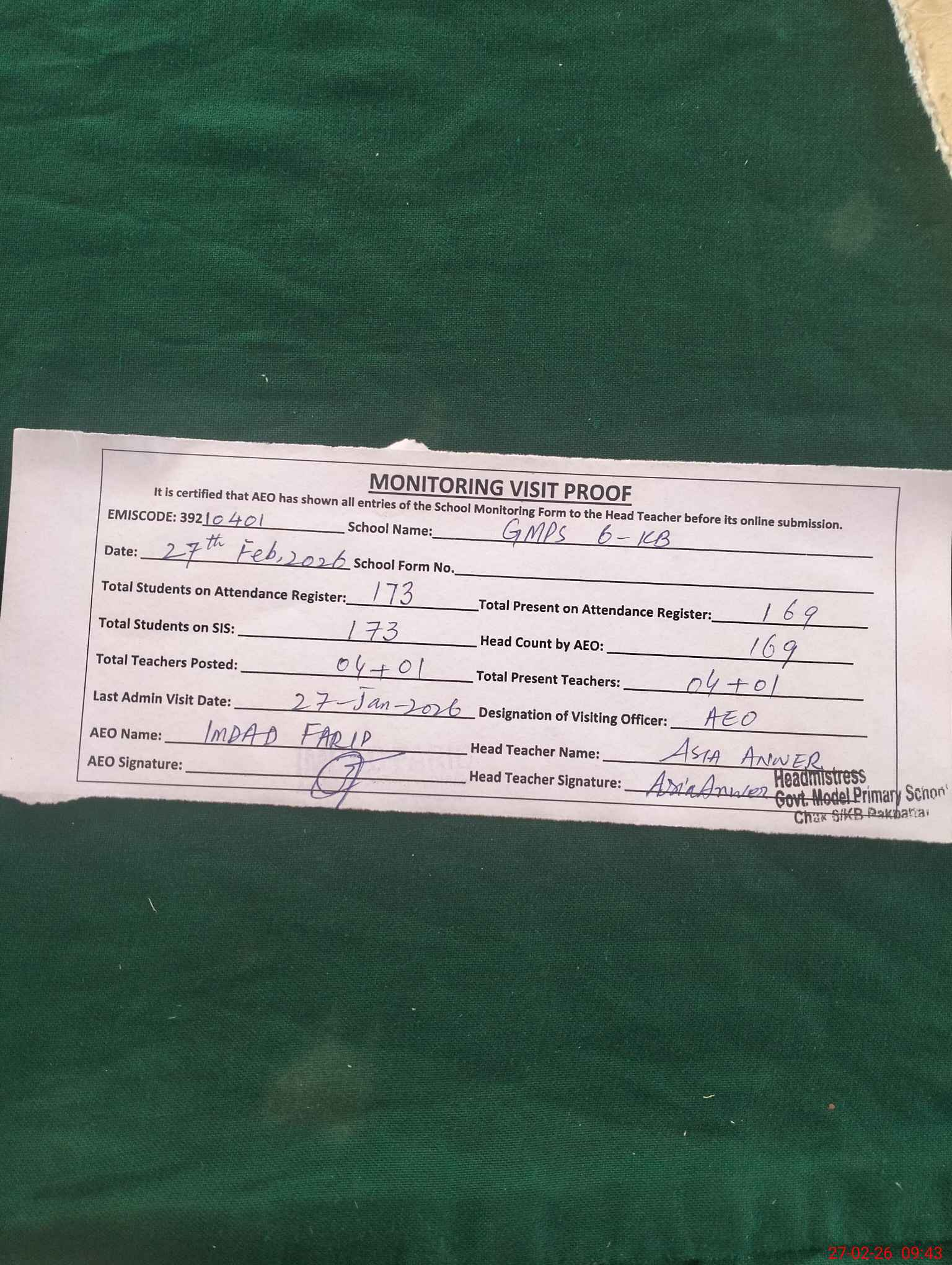 | Name: AS**** AN**** Designation: (School Headmaster's/Headmistress's) PST Phone/Cell Number: 03**** |