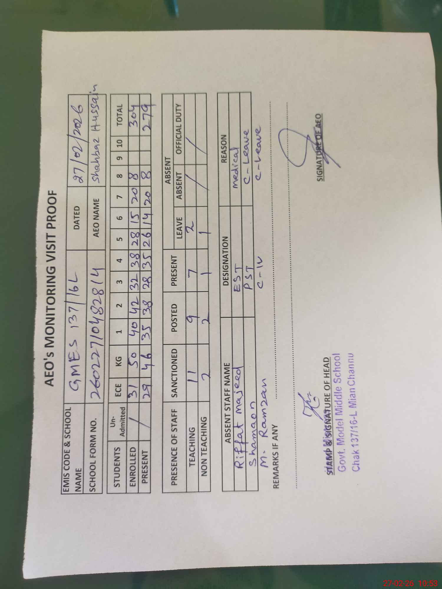 | EMIS Code: 36430331 | Name of School: GMES 137/16-L, MIAN CHANNU | |||