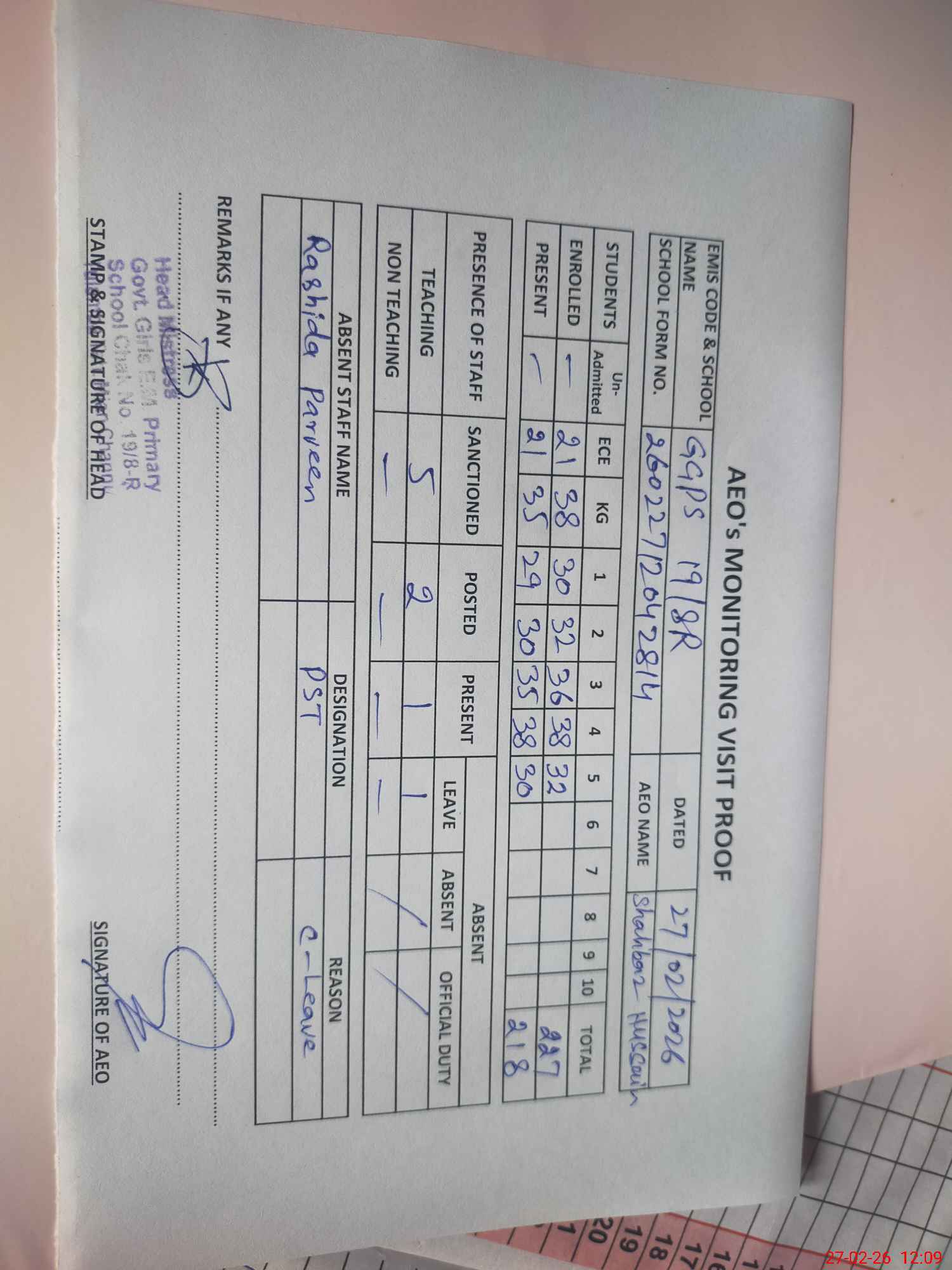 | Attendance Register | Head Teacher | MEA with School | Visit Proof |