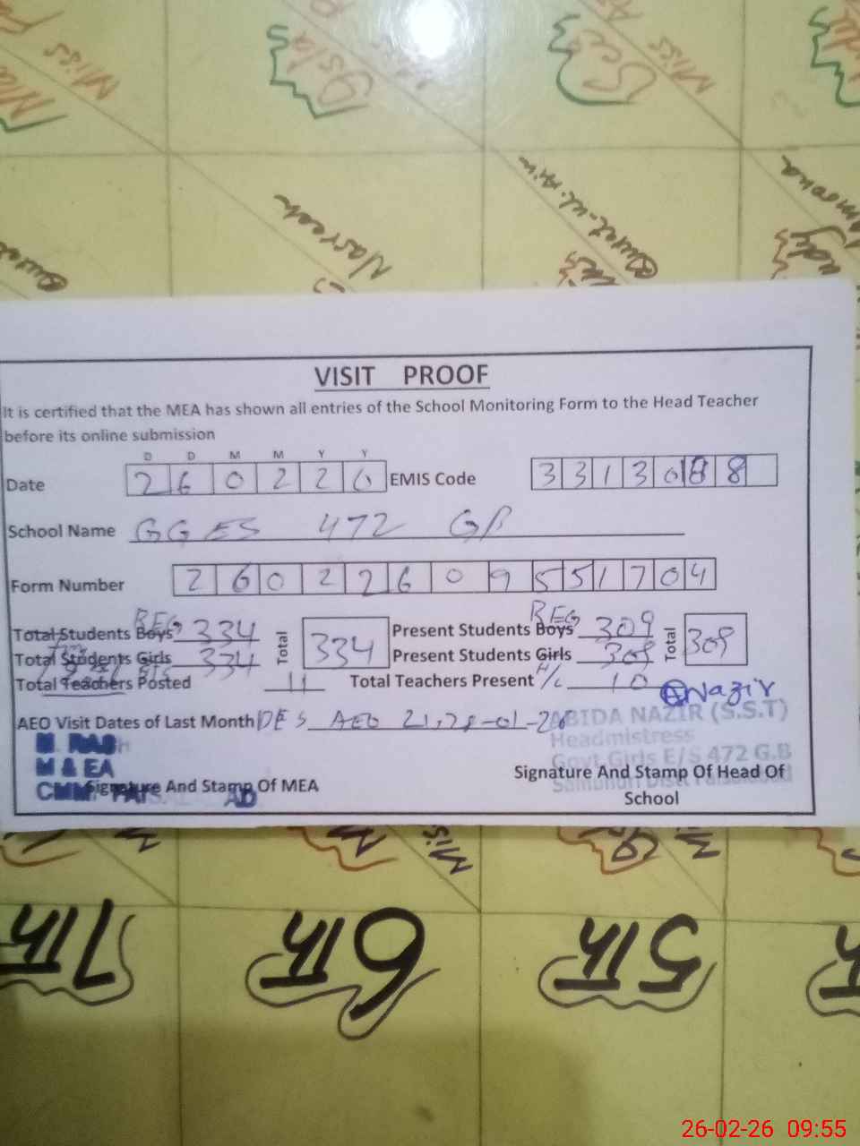 | Attendance Register | Head Teacher | MEA with School | Visit Proof |