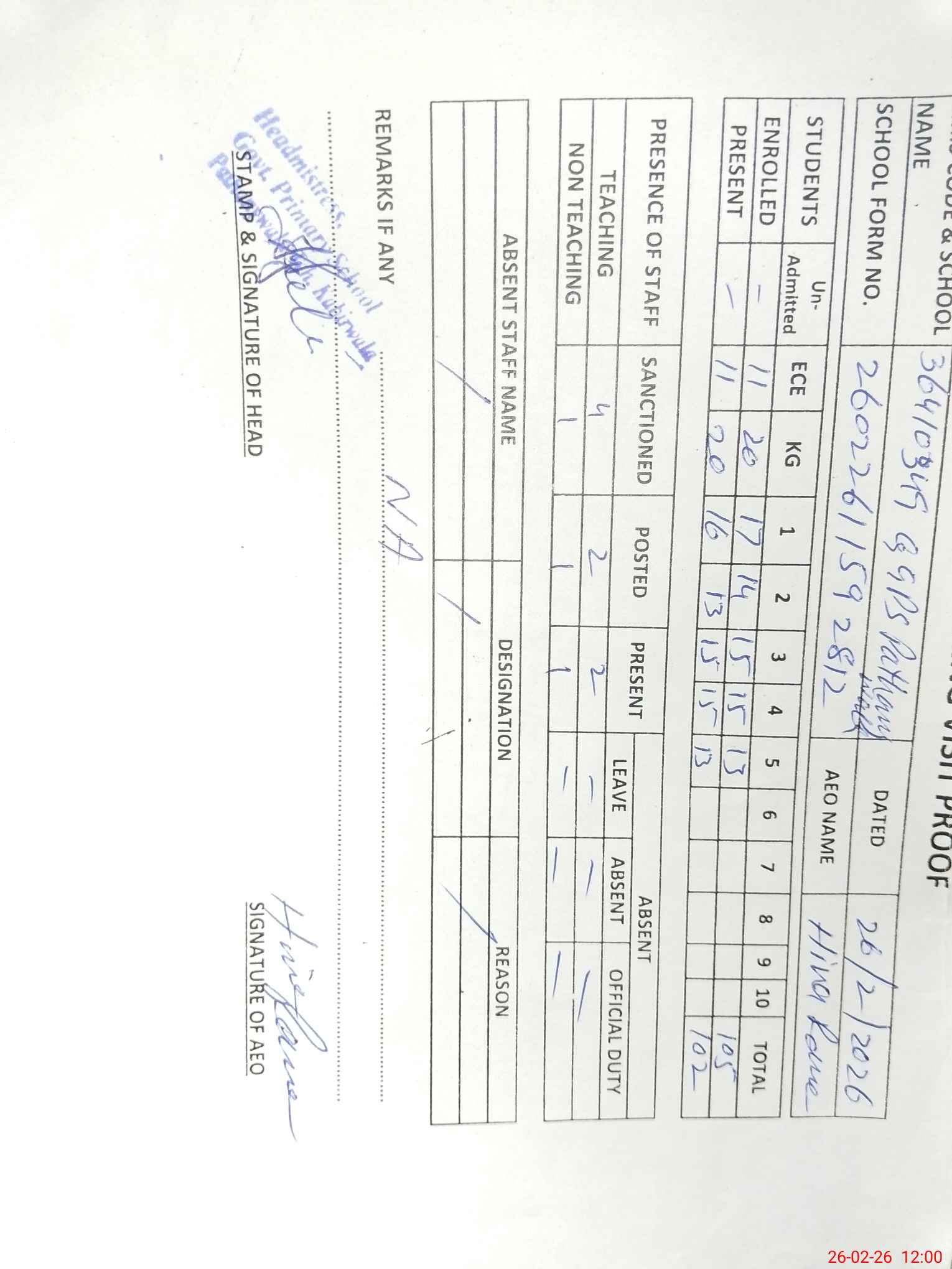 | Attendance Register | Head Teacher | MEA with School | Visit Proof |