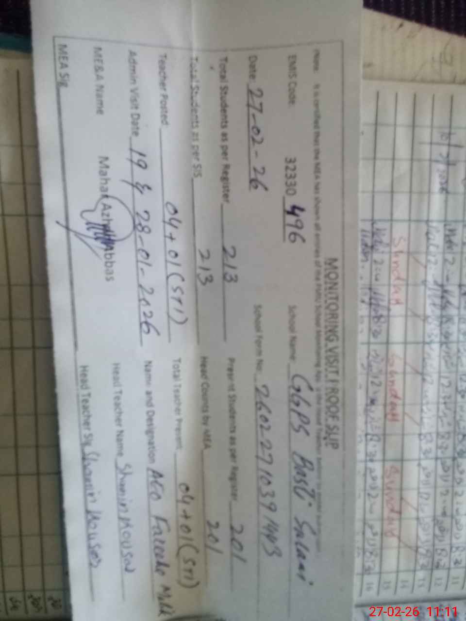 | Monitoring Date: 27-02-2026 | Start Time: 27-02-2026 10:39 AM | End Time: 27-02-2026 11:12 AM | Name of MEA: Ma**** Az**** Ab**** | |