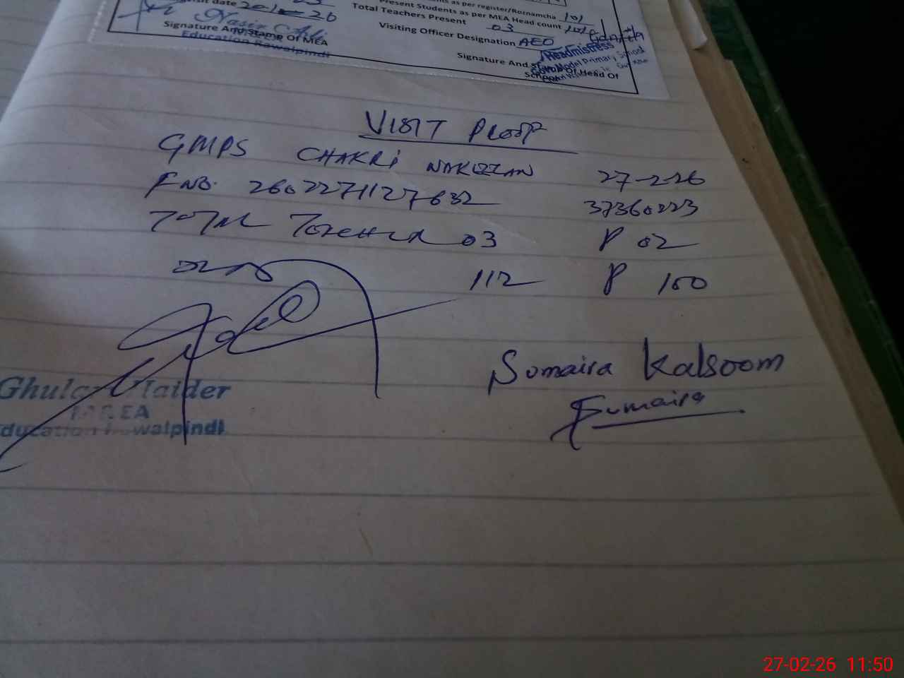 | Attendance Register | Head Teacher | MEA with School | Visit Proof |