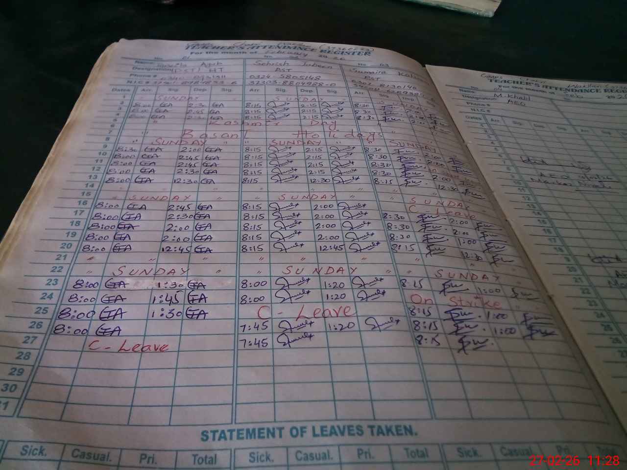 | Leave | Duty | Absent | Maternity | Medical | Ex- Pak |