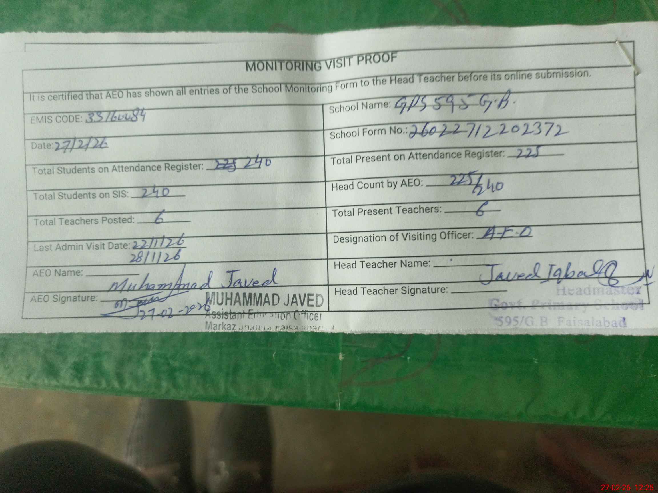 | EMIS Code: 33160084 | Name of School: GPS CHAK NO 595 GB | |||