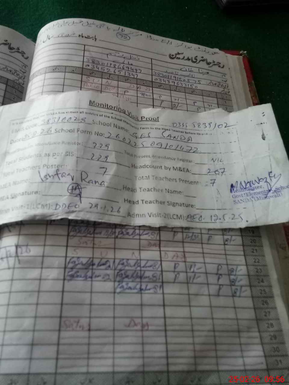 | Attendance Register | Head Teacher | MEA with School | Visit Proof |