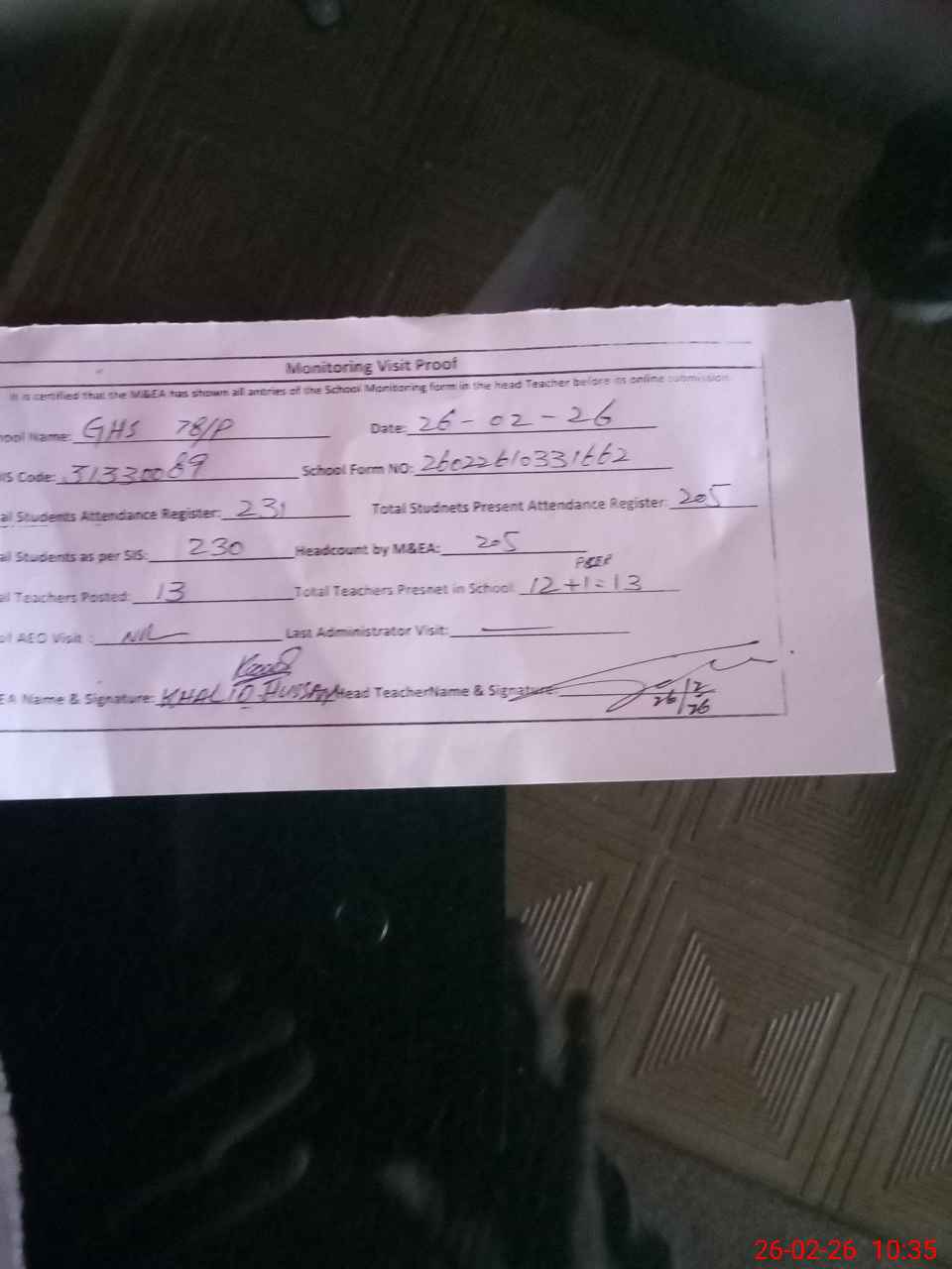 | Attendance Register | Head Teacher | MEA with School | Visit Proof |