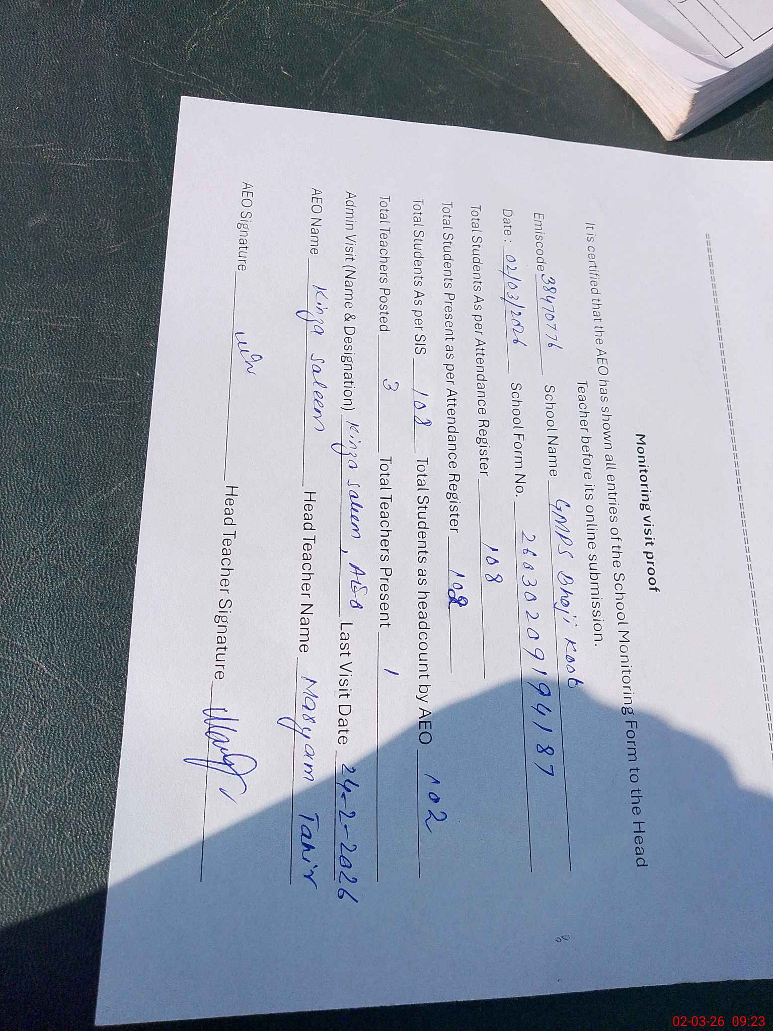 | Attendance Register | Head Teacher | MEA with School | Visit Proof |