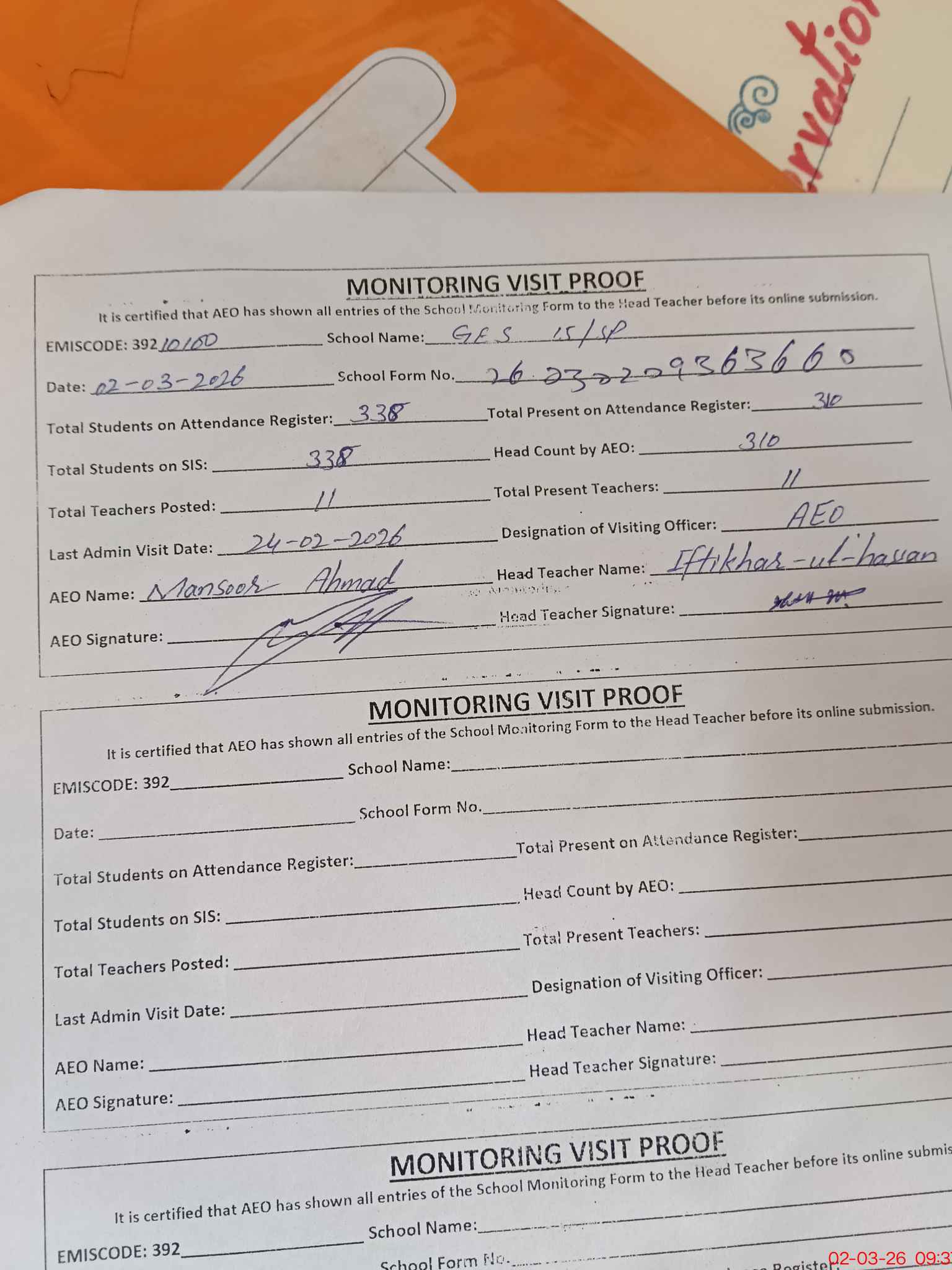 | Attendance Register | Head Teacher | MEA with School | Visit Proof |