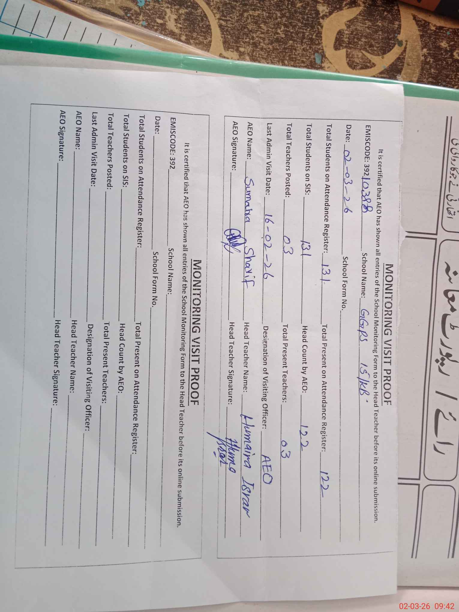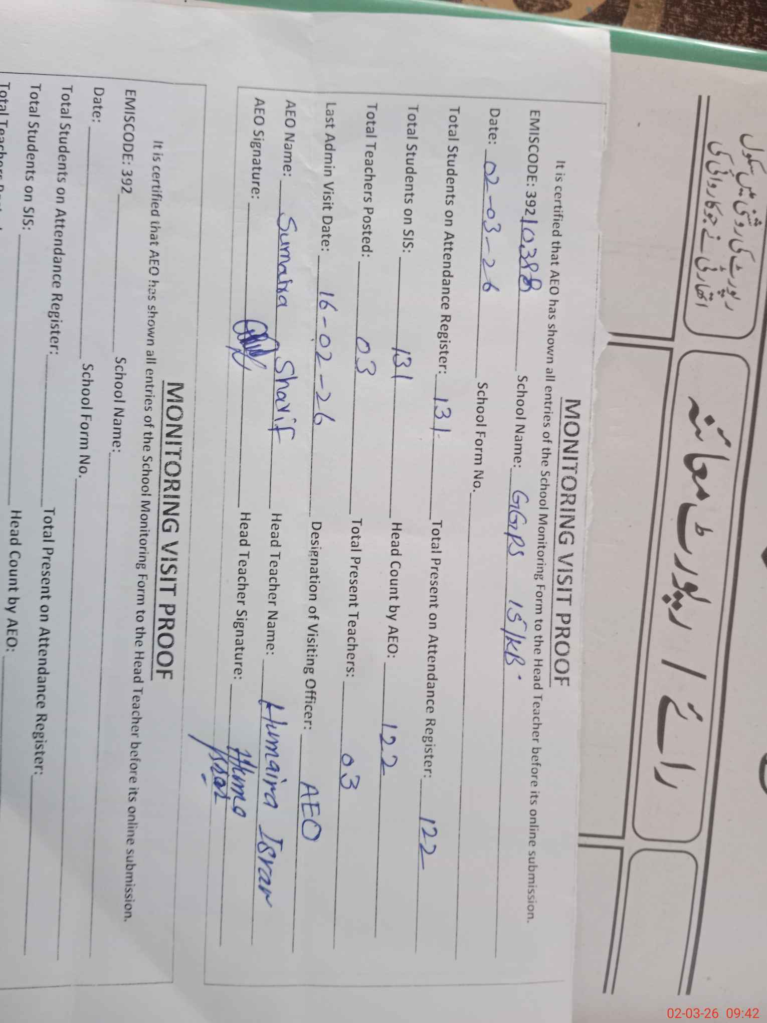 | Attendance Register | Head Teacher | MEA with School | Visit Proof |