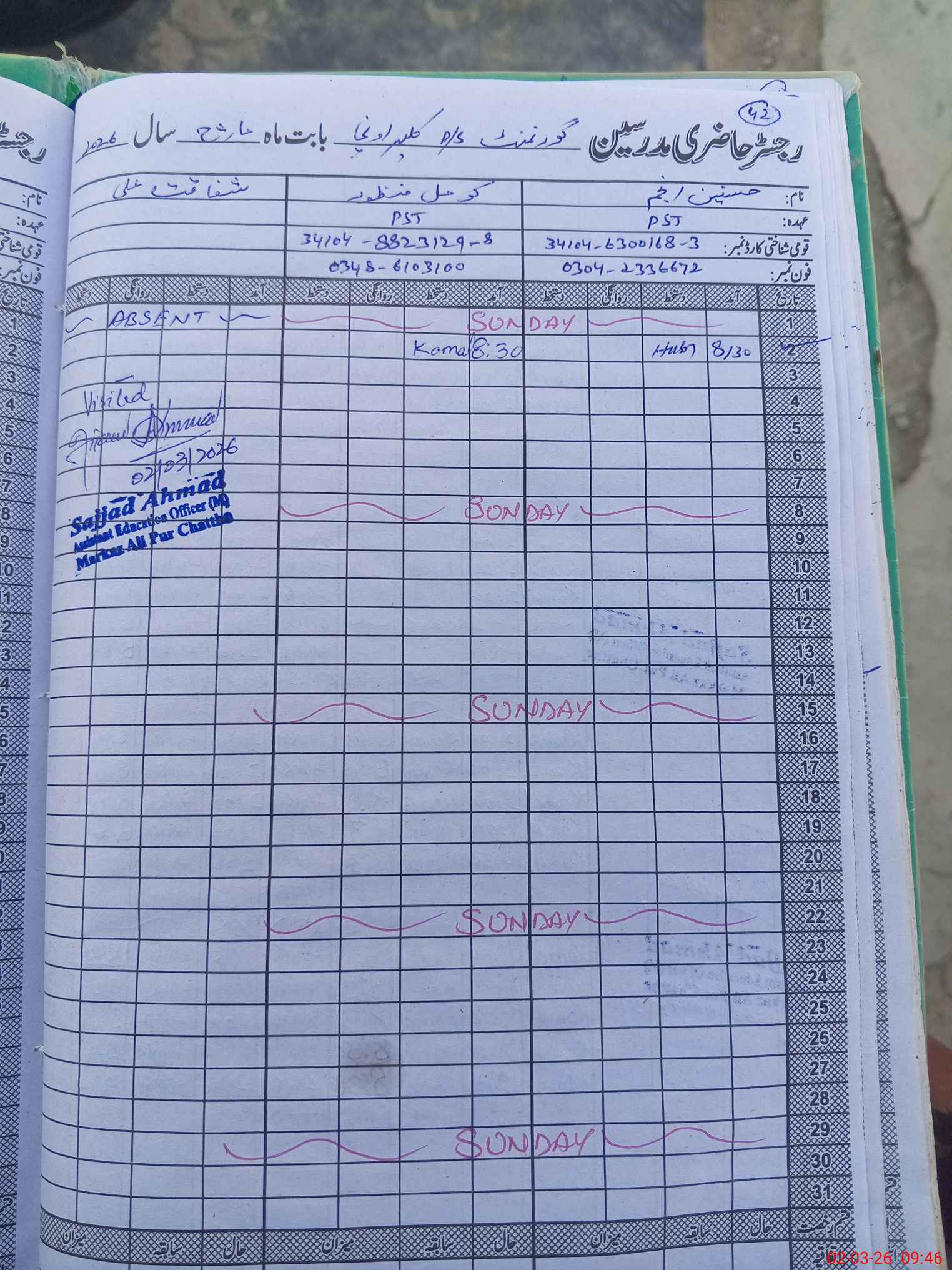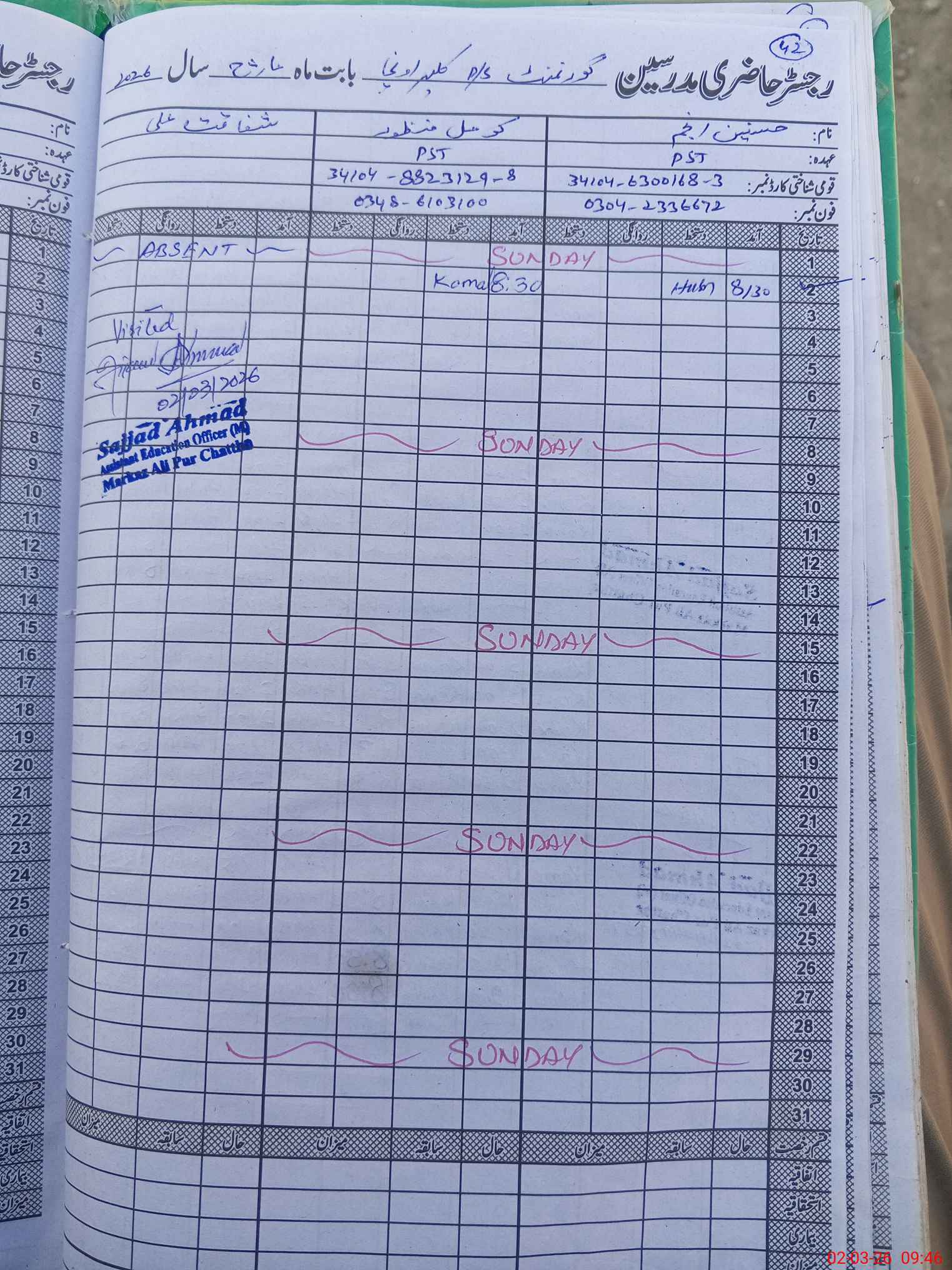 | 34**** | Sh**** Al**** | ESE (Arts) | Contract | 0 | 0 | 0 | 0 | 0 | 0 | 0 | 0 | 0 | Absent (Un-Authorized) |