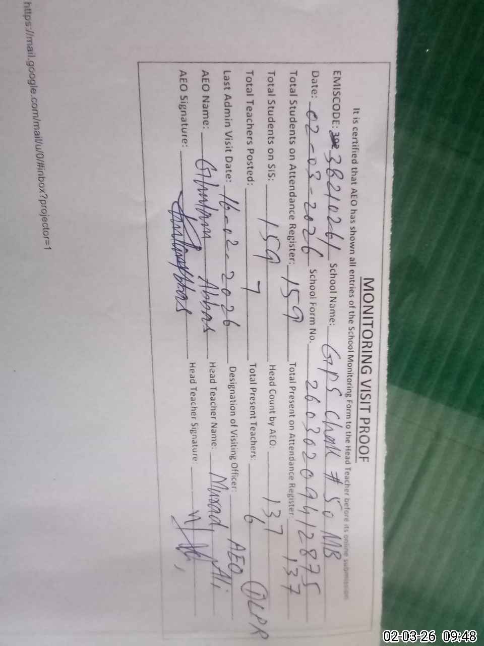 | EMIS Code: 38210261 | Name of School: GPS CHAK NO 50 MB | |||