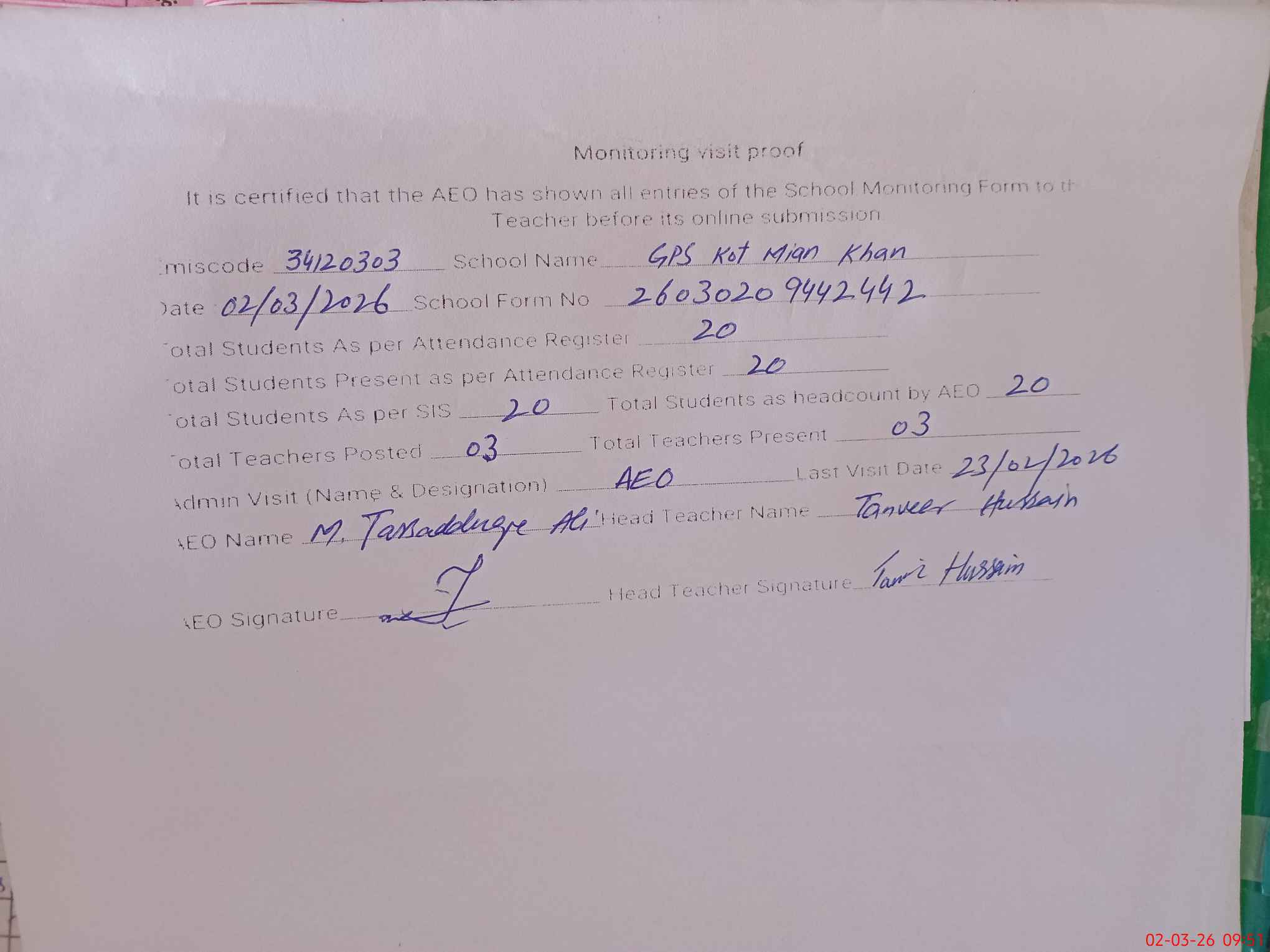 | Attendance Register | Head Teacher | MEA with School | Visit Proof |