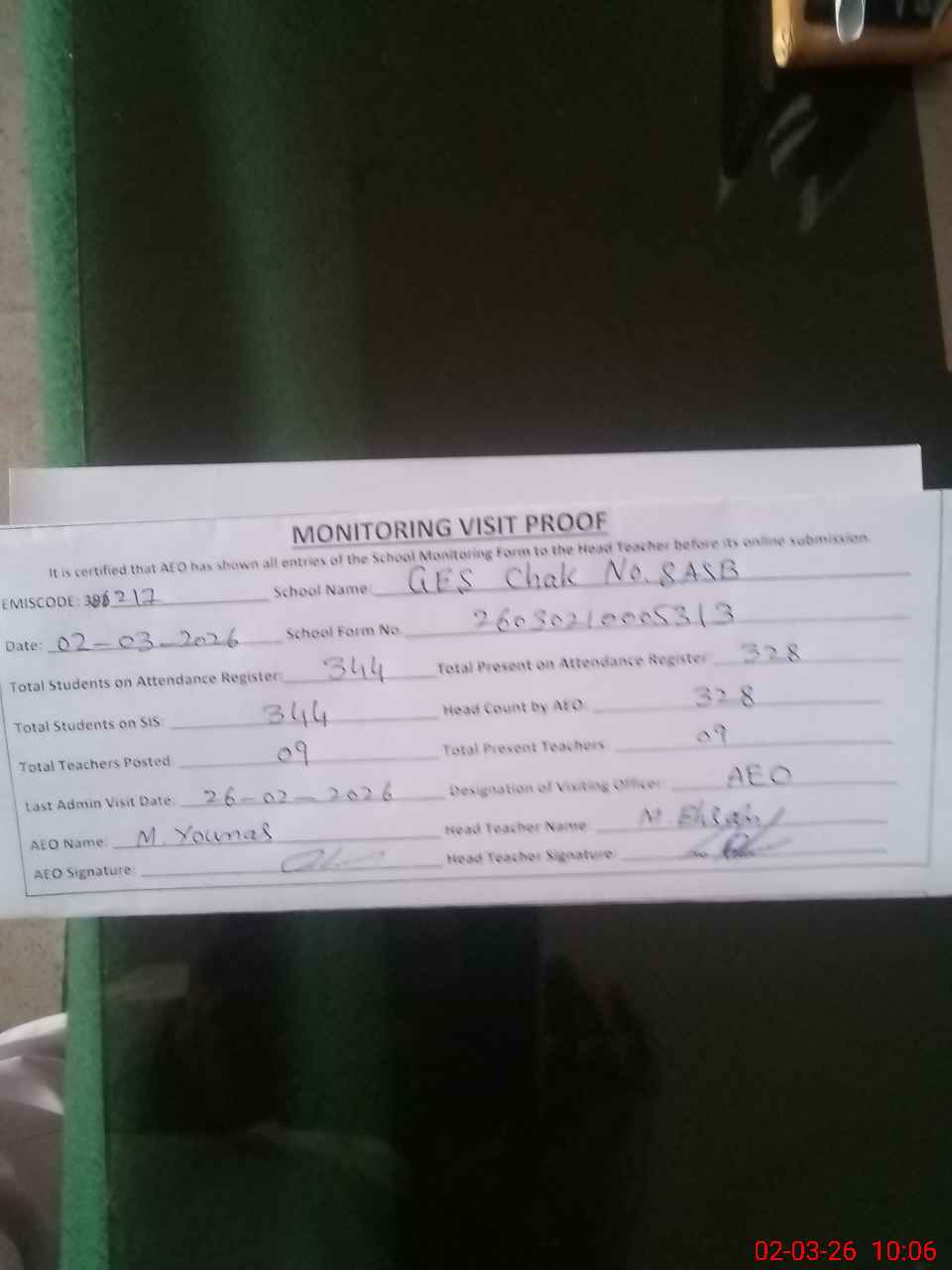 | Certified that this School was Inspected by the Undersigned MEA/DMO Today and the Information Stated Above is as Per Record. | |||||