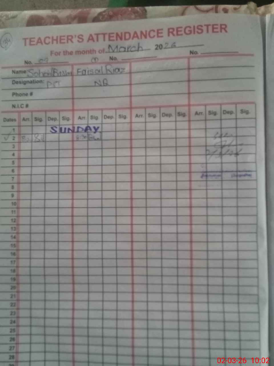 | CNIC | Full Name | Designation | R/C | Absence During Last Calender Month |